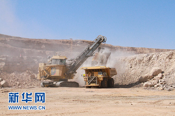 5月11日,在納米比亞西部的中廣核湖山鈾礦,載重330噸的礦用車(chē)在礦坑內(nèi)裝載礦石。新華社記者 吳長(zhǎng)偉 攝