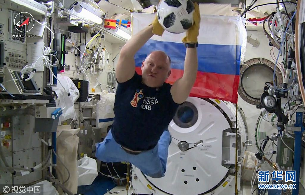 2018年5月31日,太空,俄羅斯宇航員Oleg Artemyev和自己的同事Anton Shkaplerov正在國(guó)際空間站內(nèi)玩足球,以此迎接俄羅斯世界杯的到來。(圖片來源:視覺中國(guó))