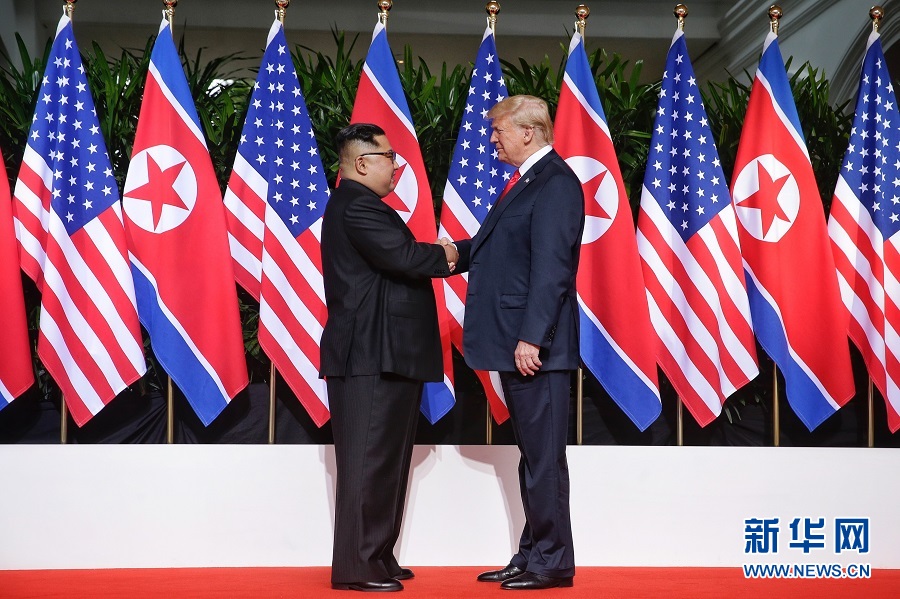 6月12日,朝鮮最高領(lǐng)導(dǎo)人金正恩(左)與美國總統(tǒng)特朗普在新加坡舉行會(huì)晤。 新華社發(fā)(新加坡海峽時(shí)報(bào)供圖)