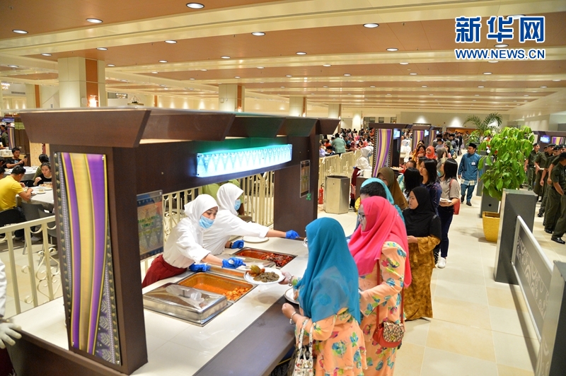 圖為16日在文萊王宮努洛伊曼宮拍攝的排隊取用自助餐的訪客。新華網(wǎng)發(fā) 杰弗里·黃攝