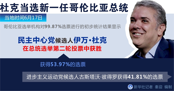 新華社波哥大6月17日電(記者何珊)哥倫比亞總統(tǒng)選舉第二輪投票17日在平靜中結束。右翼候選人杜克戰(zhàn)勝左翼候選人彼得羅,當選哥倫比亞新一任總統(tǒng)。杜克將于8月7日宣誓就職,任期至2022年。