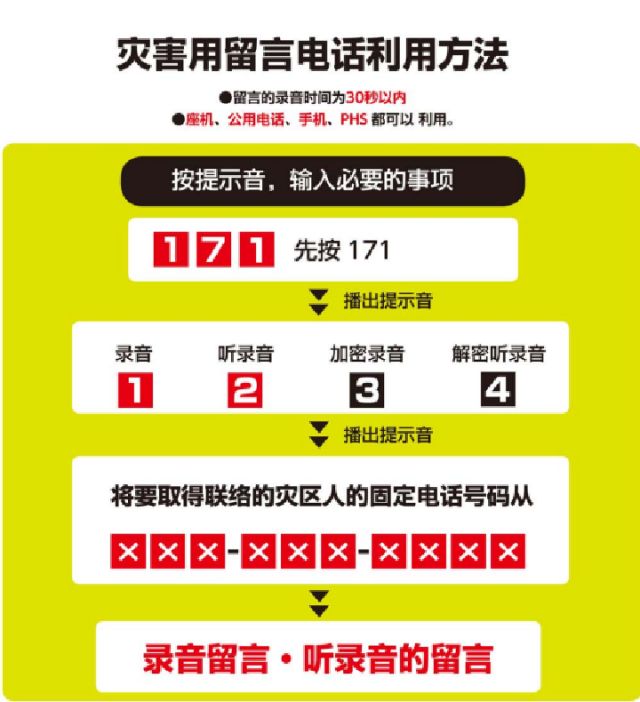 強震往往造成通信中斷。為方便民眾震后互相確認平安,日本政府設(shè)置了災(zāi)害用留言電話。若震后通信中斷,可撥打171留言或收聽親友留言,英文版介紹請見:http://www.ntt-east.co.jp/en/saigai/voice171/index.html