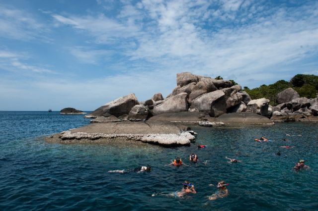 2012年7月31日,一群游客在泰國濤島的近海海灣浮潛。(新華社記者劉潺攝)