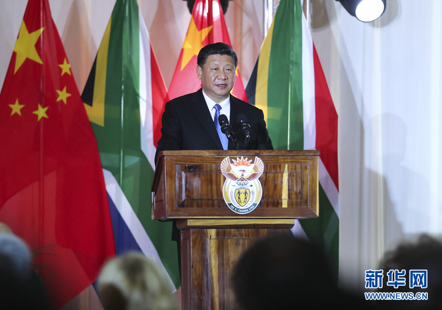 7月24日,國家主席習(xí)近平在比勒陀利亞出席南非總統(tǒng)拉馬福薩舉行的歡迎習(xí)近平主席對南非進(jìn)行國事訪問暨慶祝中南建交20周年晚宴。這是習(xí)近平發(fā)表致辭。新華社記者 謝環(huán)馳 攝
