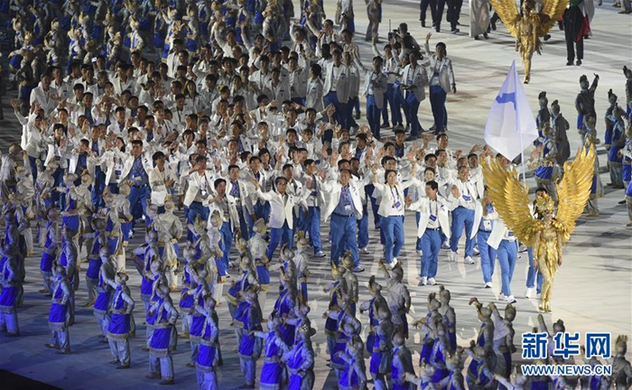 新華社雅加達(dá)8月18日電(記者 陸睿)第18屆亞運(yùn)會(huì)當(dāng)?shù)貢r(shí)間18日晚7時(shí)在雅加達(dá)朋加諾體育場(chǎng)揭開帷幕。繼今年2月韓國(guó)平昌冬奧會(huì)開幕式之后,朝鮮和韓國(guó)體育代表團(tuán)再次攜手在國(guó)際體育盛會(huì)共同入場(chǎng),引發(fā)現(xiàn)場(chǎng)觀眾歡呼。