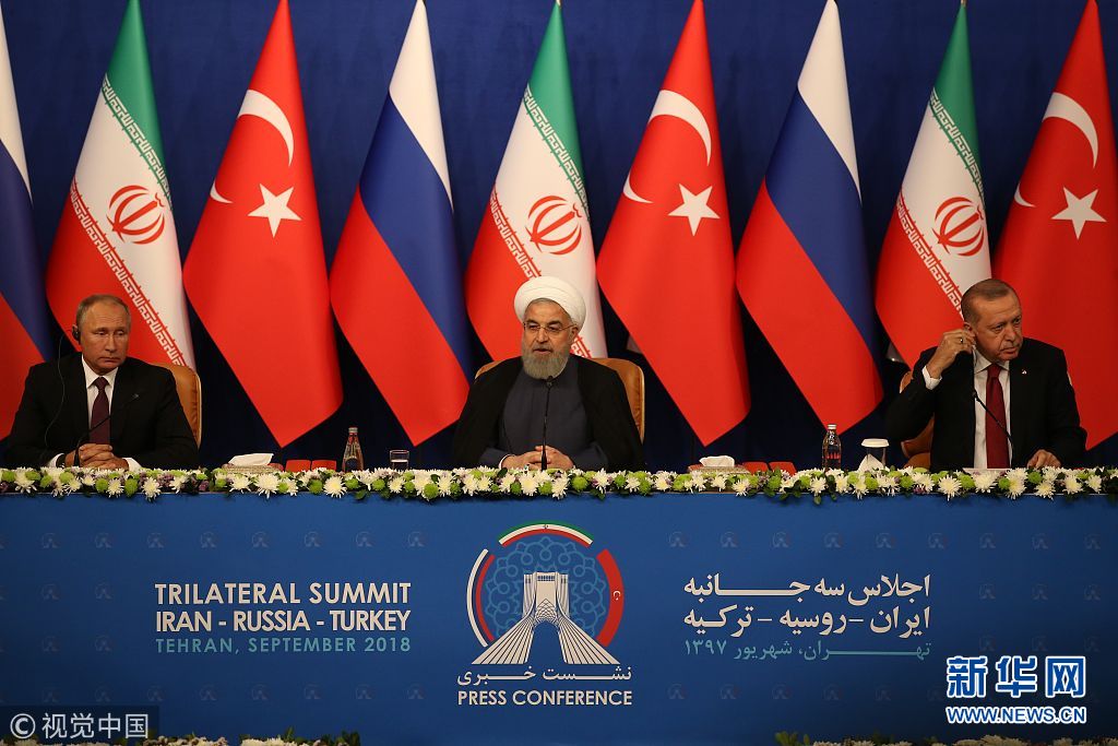 當(dāng)?shù)貢r(shí)間2018年9月7日,伊朗德黑蘭,當(dāng)日,俄羅斯、土耳其和伊朗三國(guó)首腦齊聚伊朗首都德黑蘭舉行峰會(huì),討論敘利亞局勢(shì)。(圖片來(lái)源:視覺(jué)中國(guó))