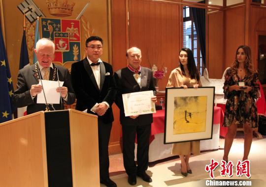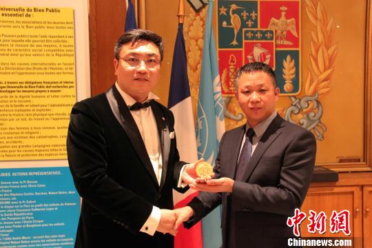 9月21日晚,中國工筆畫家崔景哲(左)在巴黎榮獲全球公益聯(lián)盟文學(xué)(藝術(shù))金質(zhì)勛章,也是此次頒獎典禮所有獲獎?wù)咧形ㄒ灰晃恢袊恕=K凱旋體育文化董事長吳愛華等知名人士對崔景哲的獲獎表示祝賀。李洋 攝