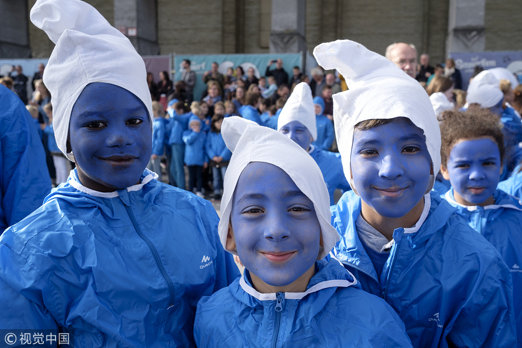 當(dāng)?shù)貢r間2018年10月23日,比利時布魯塞爾,民眾參加動畫形象“藍(lán)精靈”60歲慶?;顒印#▓D片來源:視覺中國)