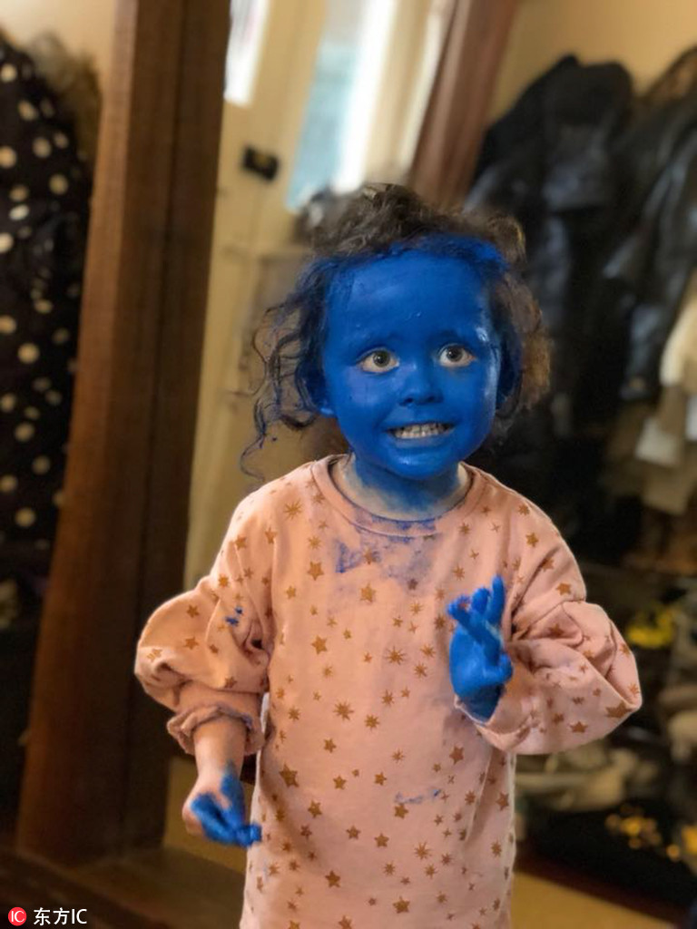 2018年4月17日報道,國外3歲的小女孩Eve把自己涂抹成了“藍(lán)精靈”?。▓D片來源:東方IC)