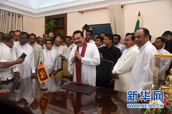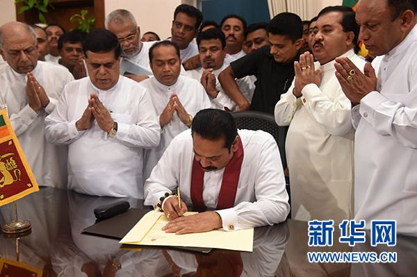 10月29日,在斯里蘭卡科倫坡,拉賈帕克薩(中)在總理辦公室舉行履新儀式。 新華社發(fā)(哈普拉徹奇 攝)