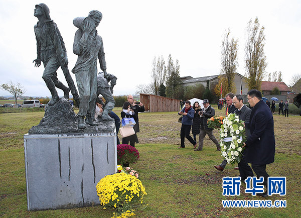 11月10日,在在比利時(shí)西佛蘭德省波珀靈厄市華工雕像園,中國駐比利時(shí)大使曹忠明(右二)、波珀靈厄市市長(zhǎng)克里斯托弗·德雅蓋(右三)等向華工雕像敬獻(xiàn)花圈。 新華社記者 葉平凡 攝