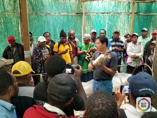 2018年9月4日,在巴布亞新幾內(nèi)亞東高地省戈羅卡市中國福建省援巴新菌草與旱稻技術(shù)合作項目基地,項目組組長林應(yīng)興向當?shù)孛癖娭v解菌草種植技術(shù)。(新華社記者莫華英攝)