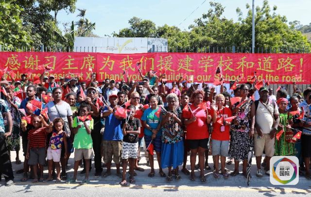 2018年11月16日,巴布亞新幾內(nèi)亞首都莫爾茲比港。當?shù)孛癖娋奂谥袊?巴新友誼學?!げ紙D卡學園門口,等待習近平主席到來。(新華社記者龐興雷攝)