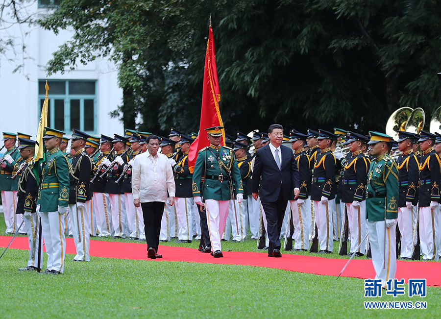 會談開始前,習(xí)近平出席杜特爾特在總統(tǒng)府前草坪舉行的隆重歡迎儀式。