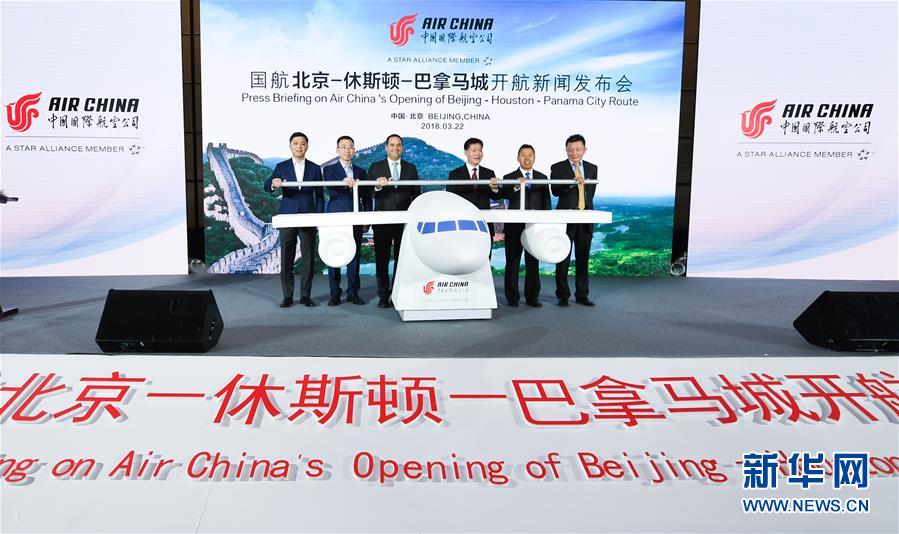 2018年3月22日,嘉賓在北京為北京—休斯頓—巴拿馬城航線開通揭幕。中國(guó)國(guó)際航空公司于4月5日開通此條新航線。新華社記者 李賀 攝