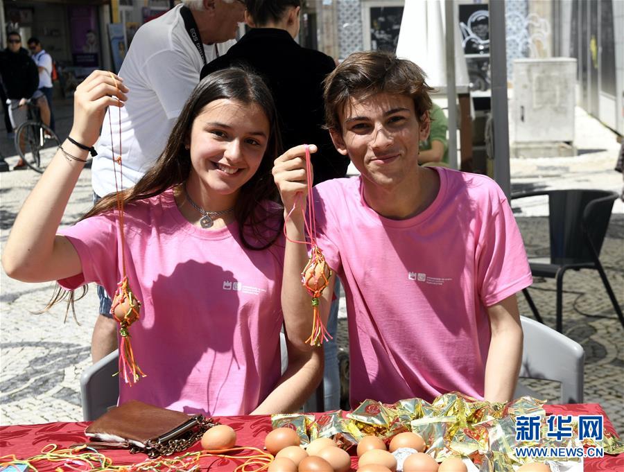 2018年6月16日,在葡萄牙阿威羅舉行的端午龍舟巡游活動(dòng)開幕式上,阿威羅大學(xué)孔子學(xué)院的學(xué)生展示他們制作的蛋袋。新華社記者 張立云 攝