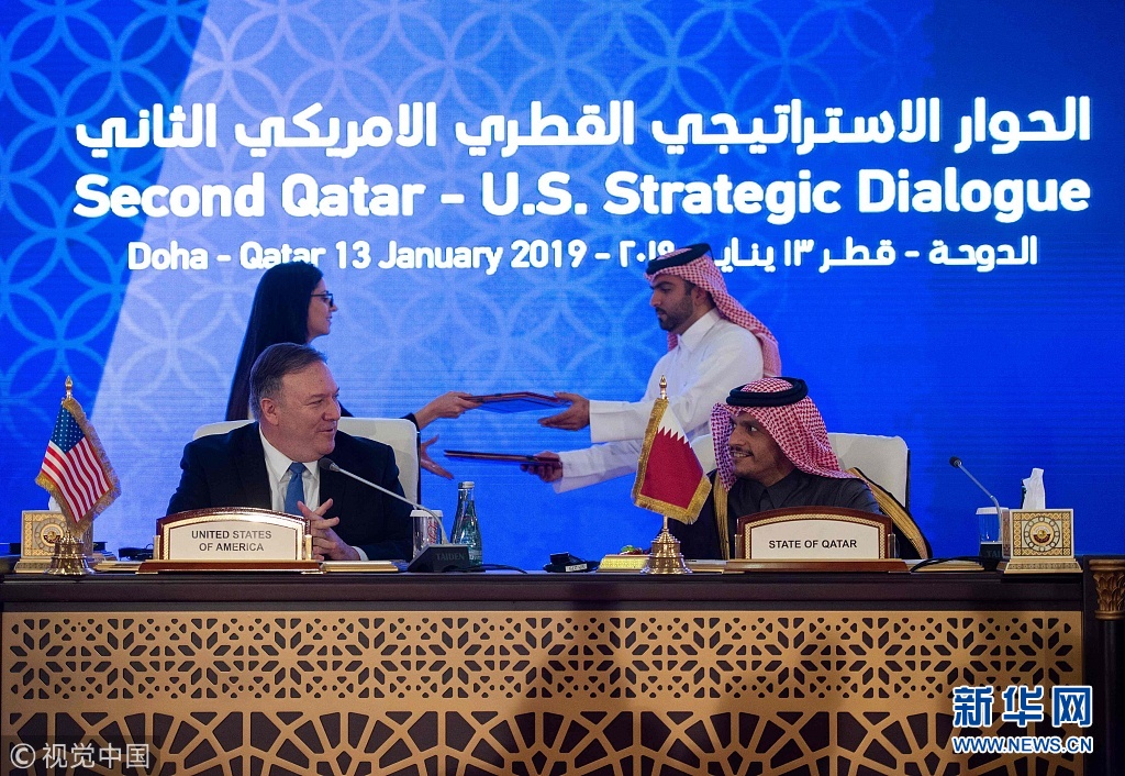 2019年1月13日,卡塔爾多哈,美國國務卿邁克·蓬佩奧訪問卡塔爾。蓬佩奧與卡塔爾副首相兼外交大臣穆罕默德在多哈的喜來登大酒店簽署了諒解備忘錄和意向聲明并舉行聯(lián)合記者會。蓬佩奧表示,兩國外交部門領導人當天簽署了一份諒解備忘錄,將擴建和改造烏代德美國空軍基地。(圖片來源:視覺中國)