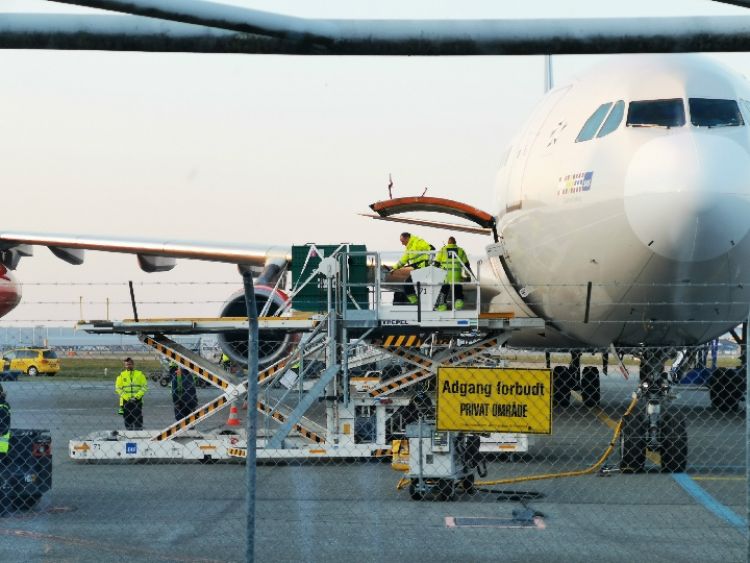 4月4日,在丹麥?zhǔn)锥几绫竟膭P斯楚普國際機(jī)場,工作人員將裝有中國大熊貓的箱子搬出,準(zhǔn)備運(yùn)往哥本哈根動物園。(新華社發(fā) 李鵬飛攝)