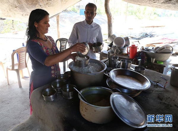 3月26日,在尼泊爾蘇爾凱德,阿查亞(右)與占茜準備食物。新華社發(fā)(蘇尼爾·夏爾馬 攝)
