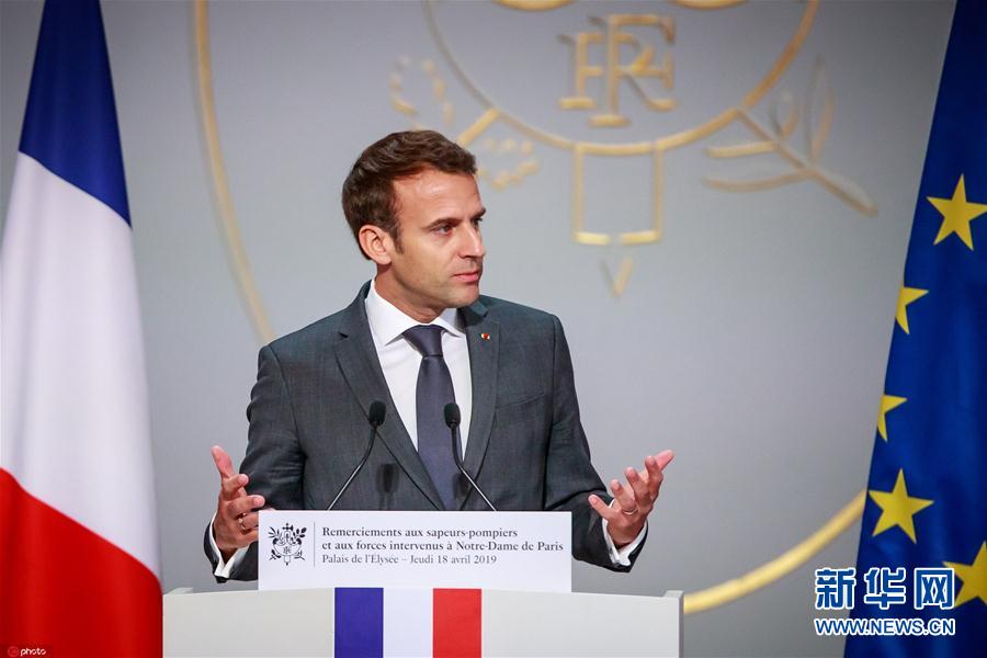 當(dāng)?shù)貢r(shí)間2019年4月18日,法國(guó)巴黎,法國(guó)總統(tǒng)馬克龍?jiān)趷?ài)麗舍宮接見(jiàn)參與巴黎圣母院火災(zāi)救援任務(wù)的消防員。(圖片來(lái)源:東方IC)