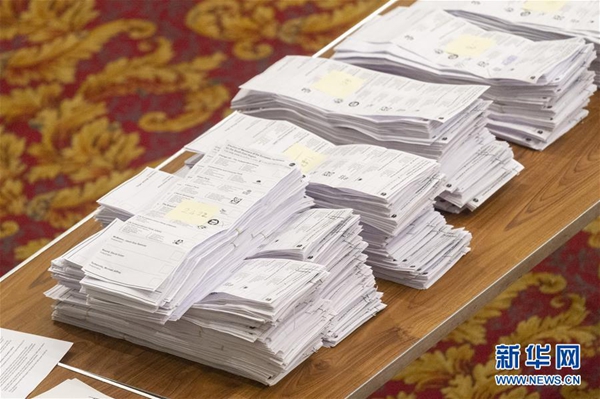 這是5月26日在英國南安普敦的一個計票站拍攝的選票。五年一次的歐洲議會選舉23日至26日在歐盟28個成員國間舉行。選民將選舉出751名議員,組成第九屆歐洲議會,任期5年。新華社發(fā)(雷伊·唐 攝)