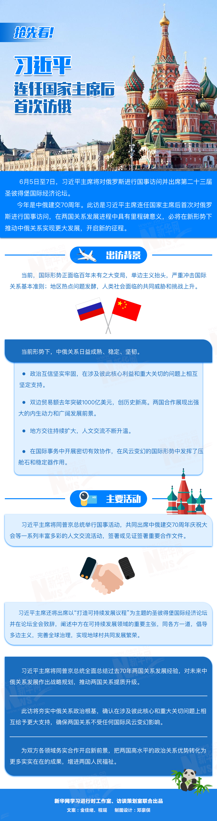 訪問期間,除國事活動(dòng)外,習(xí)近平主席將同普京總統(tǒng)共同出席中俄建交70周年慶祝大會(huì)等一系列豐富多彩的人文交流活動(dòng),簽署或見證簽署重要合作文件。