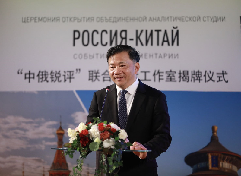 中宣部副部長、中央廣播電視總臺(tái)臺(tái)長慎海雄和俄羅斯報(bào)社長涅戈伊察為“中俄銳評(píng)”聯(lián)合評(píng)論工作室揭牌