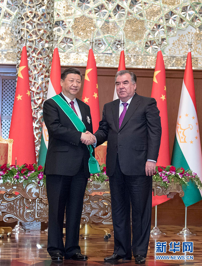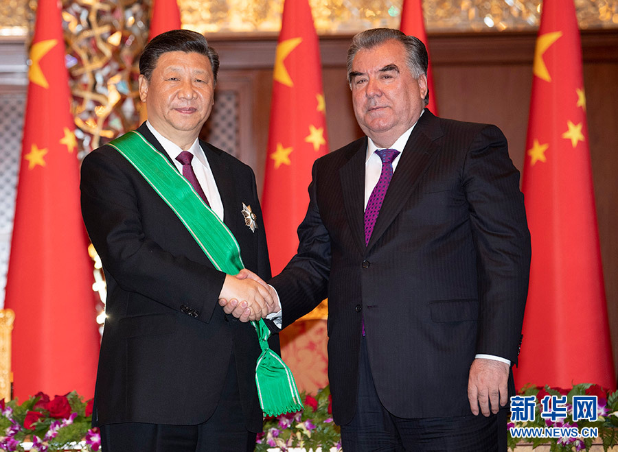 6月15日,國(guó)家主席習(xí)近平在杜尚別出席儀式,接受塔吉克斯坦總統(tǒng)拉赫蒙授予“王冠勛章”。 新華社記者 沙達(dá)提 攝
