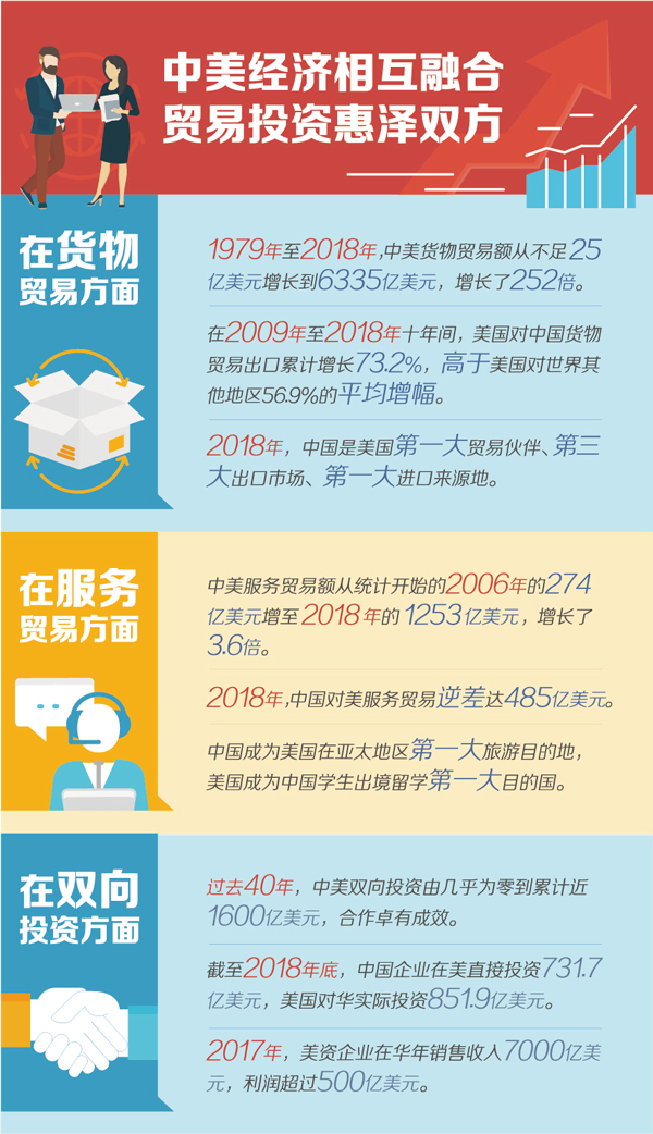 在國際經(jīng)濟合作中,正常的貿(mào)易關(guān)系是建立在等價交換基礎上的互惠互利關(guān)系,而不是你多我少、你輸我贏的“零和博弈”。國際貿(mào)易有利于推動資源在世界范圍內(nèi)優(yōu)化配置,促進各國經(jīng)濟共同發(fā)展,推動人類社會共同進步,國際貿(mào)易的歷史早已證明這樣的實踐是有效的,實踐經(jīng)驗也早已成為國際經(jīng)濟學的基本原理,中美經(jīng)貿(mào)合作的事實也作了同樣的驗證。中美建交以來,在雙邊貿(mào)易方面,1979年至2018年,雙邊貨物貿(mào)易額從不足25億美元增長到6335億美元,增長了252倍;在雙向投資領域,過去40年,中美雙向投資由幾乎為零到累計近1600億美元,中美互為對方重要投資伙伴,投資的雙向性和互惠性進一步顯現(xiàn)。中美經(jīng)貿(mào)關(guān)系發(fā)展的歷程證明,中美通過優(yōu)勢互補、互通有無,有力促進了各自經(jīng)濟發(fā)展和產(chǎn)業(yè)結(jié)構(gòu)優(yōu)化升級,雙方經(jīng)貿(mào)往來是惠澤彼此的關(guān)系,而非中國讓美國“吃虧”的過程。