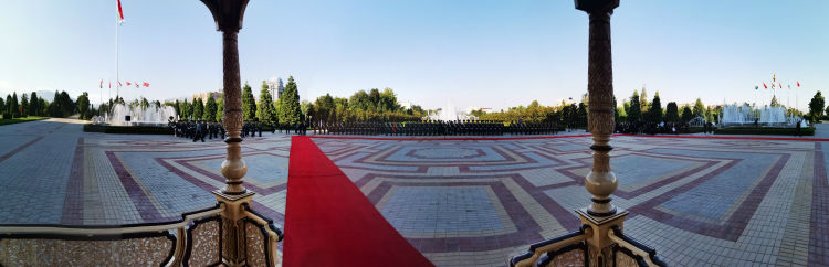 儀仗隊(duì)在塔吉克斯坦總統(tǒng)府列隊(duì),等候兩國元首檢閱。遠(yuǎn)處高聳的旗桿位于總統(tǒng)府外的國旗公園,高165米,是杜尚別的地標(biāo)建筑之一。新華社記者 霍小光 攝