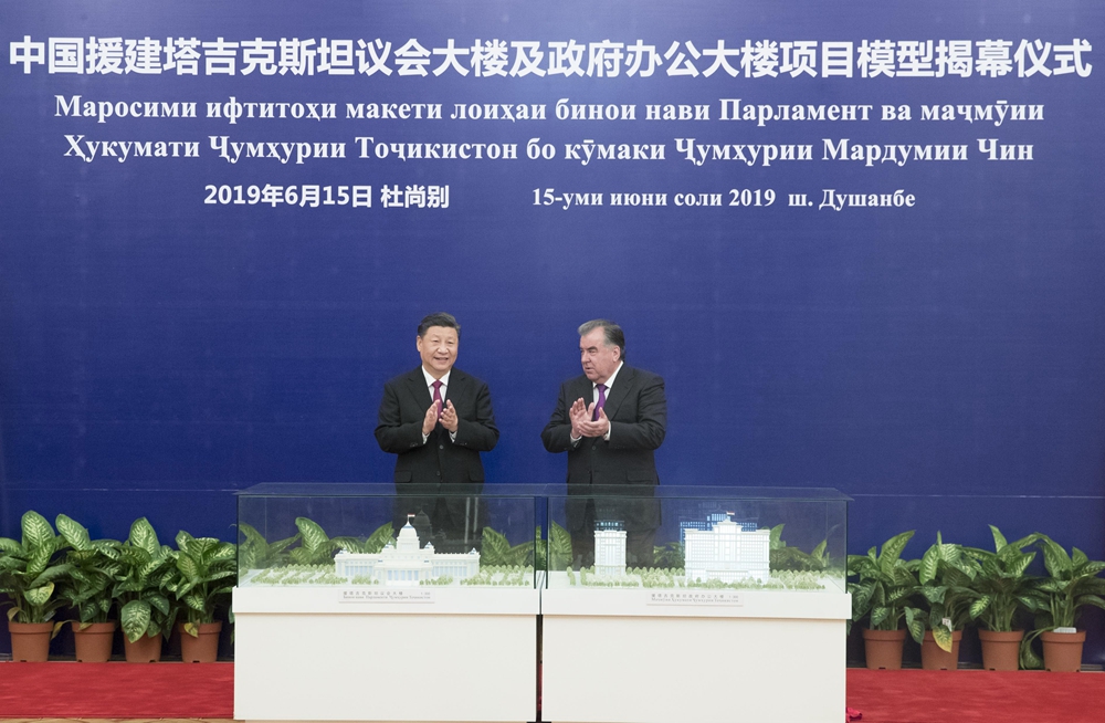 6月15日,國家主席習(xí)近平在杜尚別同塔吉克斯坦總統(tǒng)拉赫蒙會(huì)談。會(huì)談后,兩國元首共同出席中方援塔議會(huì)大樓、政府辦公大樓項(xiàng)目模型揭幕儀式。新華社記者 王曄 攝