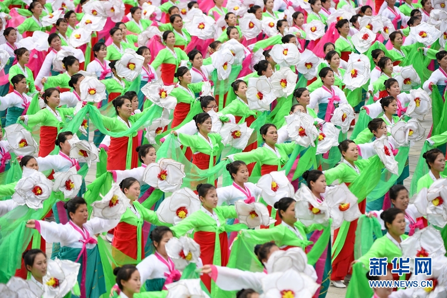 明媚的陽光下,錦繡山太陽宮廣場顯得格外雄偉,金日成、金正日的巨幅畫像并排高高懸掛,大型花壇鋪展在寬闊的廣場中間。錦繡山太陽宮廣場上,歡迎的人群身著節(jié)日的盛裝,呈方陣排列。