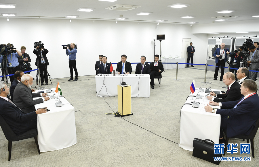 6月28日,國(guó)家主席習(xí)近平在大阪出席中俄印領(lǐng)導(dǎo)人會(huì)晤,同俄羅斯總統(tǒng)普京、印度總理莫迪就當(dāng)前國(guó)際形勢(shì)、重大國(guó)際和地區(qū)問(wèn)題、三方合作深入交換意見(jiàn)。新華社記者 謝環(huán)馳 攝
