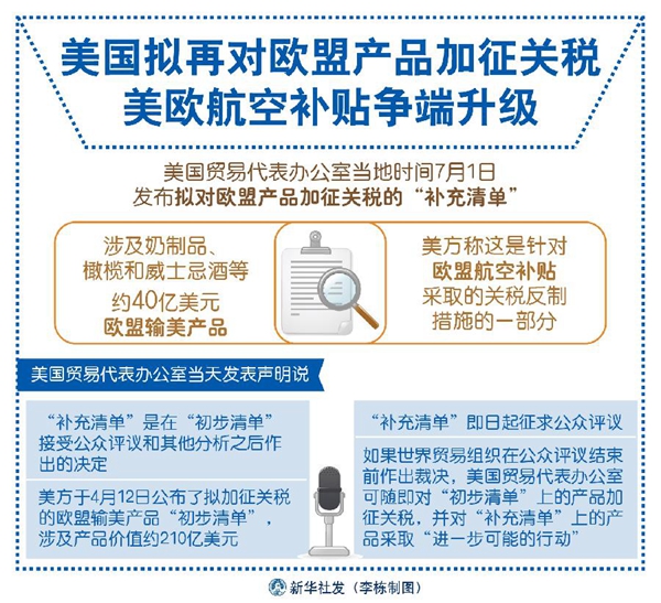 美國貿(mào)易代表辦公室當(dāng)天發(fā)表聲明說,“補充清單”是在“初步清單”接受公眾評議和其他分析之后作出的決定。美方于4月12日公布了擬加征關(guān)稅的歐盟輸美產(chǎn)品“初步清單”,涉及產(chǎn)品價值約210億美元。