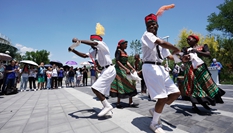 7月2日,在白俄羅斯首都明斯克郊區(qū)的中白工業(yè)園,身著白俄羅斯民族服裝的人們在演唱民族歌曲。新華社發(fā)(任科夫攝)