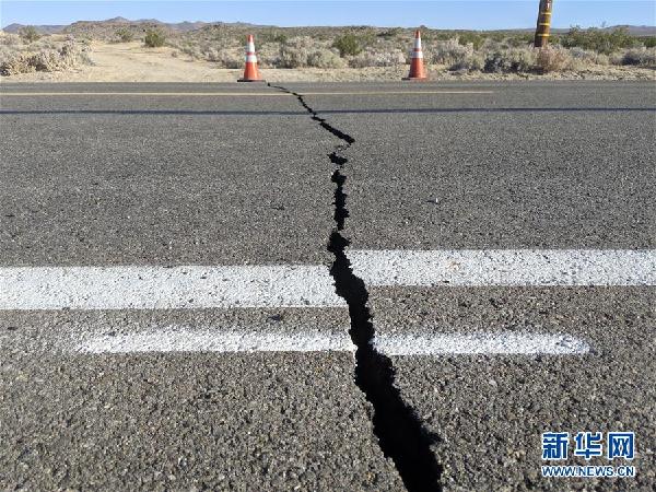 7月6日,在美國加利福尼亞州小鎮(zhèn)特羅納,道路在地震中受損(手機(jī)照片)。 美國加利福尼亞州南部地區(qū)4日和5日先后發(fā)生6.4級(jí)和7.1級(jí)地震,震中和附近地區(qū)遭不同程度破壞。兩次強(qiáng)震震中所在地區(qū)圣貝納迪諾縣已經(jīng)進(jìn)入緊急狀態(tài)。 新華社記者 檀易曉 攝
