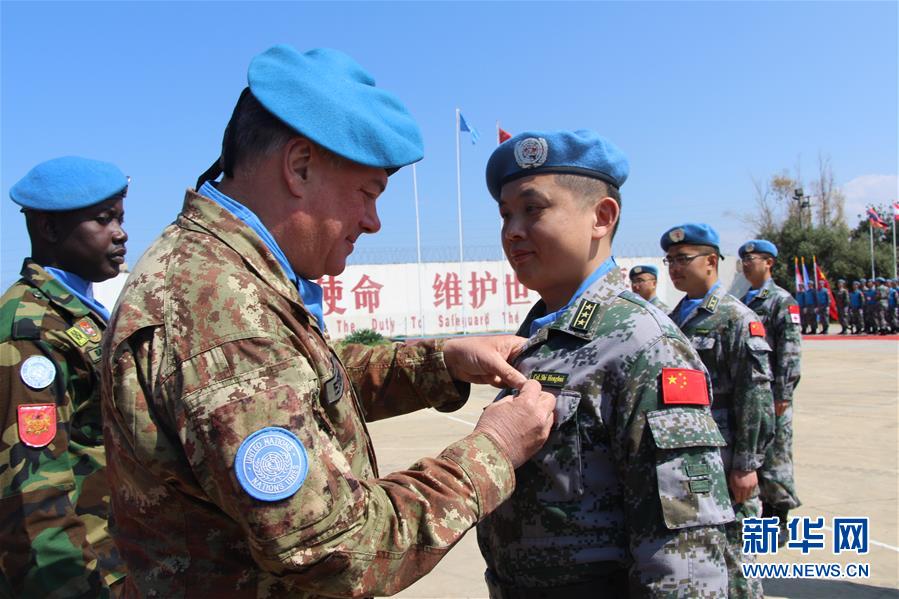 4月3日,在位于黎巴嫩南部辛尼亞村的中國維和部隊(duì)營區(qū)舉行的授勛儀式上,聯(lián)黎部隊(duì)司令德爾科爾(前左)為官兵代表佩戴勛章。新華社發(fā)