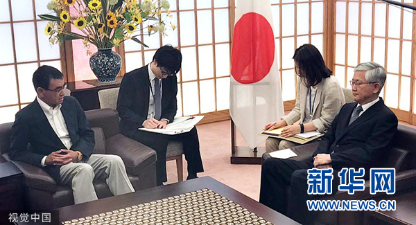 7月19日,日本東京,日本外務(wù)大臣河野太郎召見韓國駐日本大使南官杓,抗議韓方對日方提出的成立包含第三國成員的仲裁委員會(huì)來解決“強(qiáng)征勞工索賠案”的提議不予回應(yīng)的做法。(圖片來源:視覺中國)
