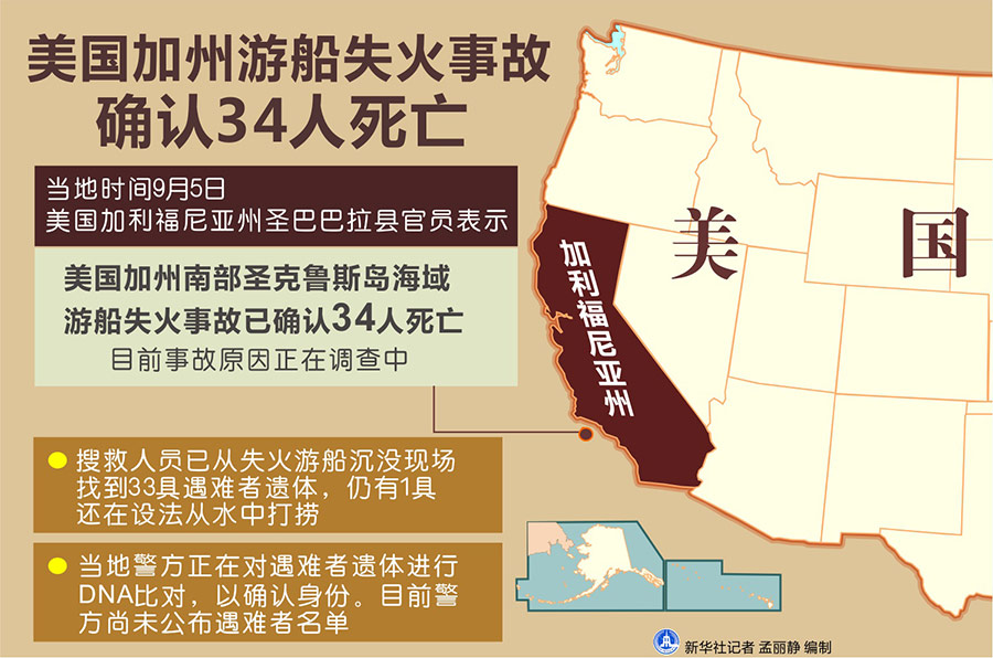 新華社洛杉磯9月5日電(記者譚晶晶 高山)美國(guó)加利福尼亞州圣巴巴拉縣官員5日表示,美國(guó)加州游船失火事故已確認(rèn)34人死亡。目前事故原因正在調(diào)查中。