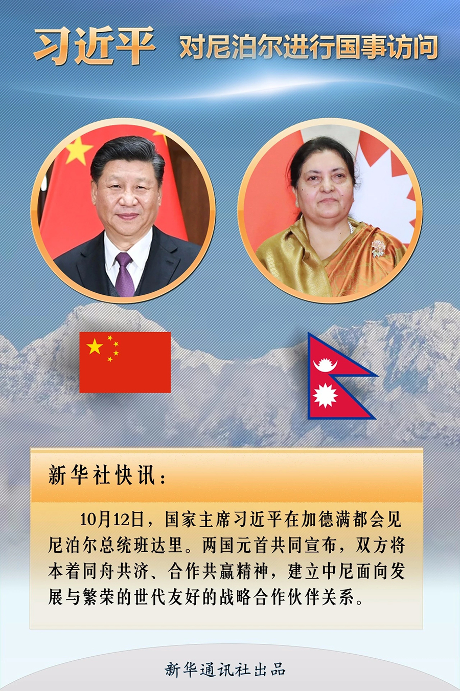 新華社加德滿都10月12日電 10月12日,國家主席習(xí)近平在加德滿都會見尼泊爾總統(tǒng)班達(dá)里。兩國元首共同宣布,雙方將本著同舟共濟(jì)、合作共贏精神,建立中尼面向發(fā)展與繁榮的世代友好的戰(zhàn)略合作伙伴關(guān)系。