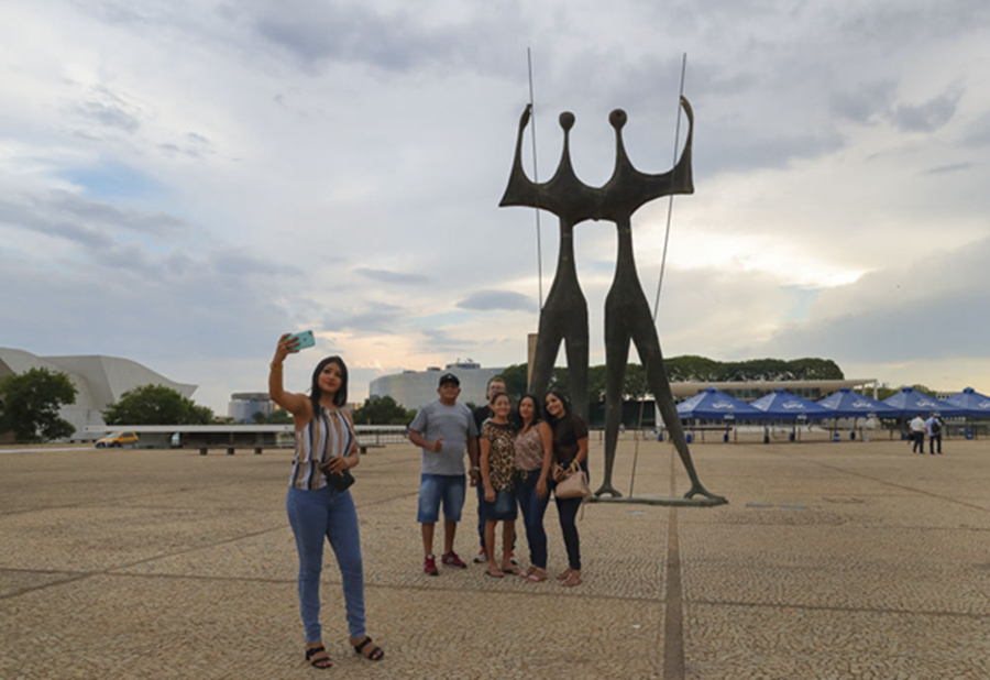 這是2019年11月2日,游人在巴西利亞三權(quán)廣場(chǎng)首都開拓者雕像前合影。新華社記者蘭紅光攝
