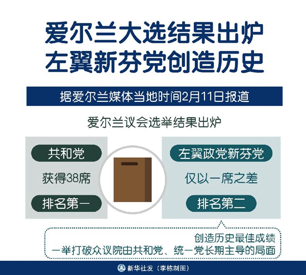 新華社都柏林2月11日電(記者張琪)據(jù)愛爾蘭媒體11日報(bào)道,愛爾蘭議會選舉結(jié)果出爐:共和黨獲得38席,排名第一;左翼政黨新芬黨僅以一席之差排名第二,創(chuàng)造歷史最佳成績,一舉打破眾議院由共和黨、統(tǒng)一黨長期主導(dǎo)的局面。