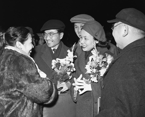 團長清水正夫(前左二)和夫人松山樹子(前左三)率領(lǐng)的日本松山芭蕾舞蹈團于1958年3月8日到達北京,受到首都戲劇舞蹈界人士的熱烈歡迎。新華社記者吳化學(xué)攝