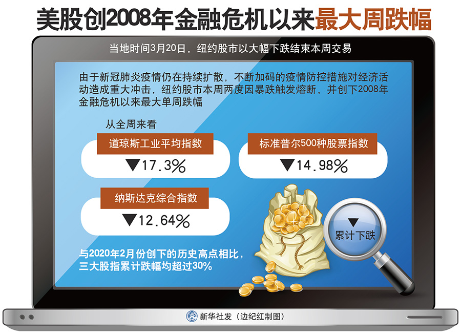 由于新冠肺炎疫情仍在持續(xù)擴(kuò)散,不斷加碼的疫情防控措施對(duì)經(jīng)濟(jì)活動(dòng)造成重大沖擊,紐約股市本周兩度因暴跌觸發(fā)熔斷,并創(chuàng)下2008年金融危機(jī)以來最大單周跌幅。