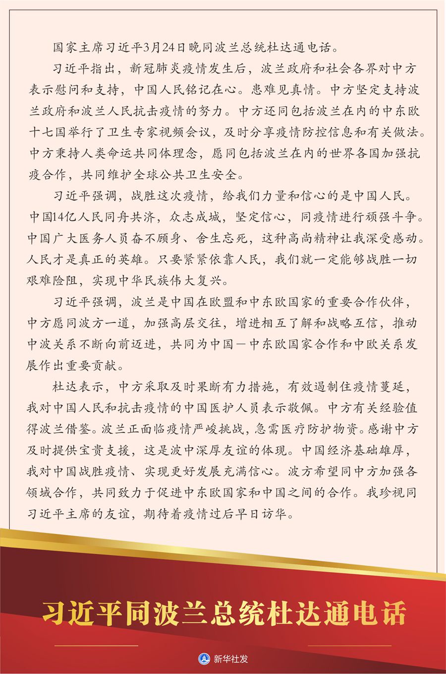新華社北京3月24日電? 國家主席習(xí)近平24日晚同波蘭總統(tǒng)杜達通電話。