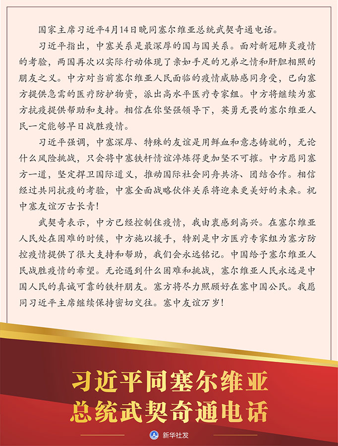 習(xí)近平指出,中塞關(guān)系是最深厚的國與國關(guān)系。面對新冠肺炎疫情的考驗(yàn),兩國再次以實(shí)際行動(dòng)體現(xiàn)了親如手足的兄弟之情和肝膽相照的朋友之義。中方對當(dāng)前塞爾維亞人民面臨的疫情威脅感同身受,已向塞方提供急需的醫(yī)療防護(hù)物資,派出高水平醫(yī)療專家組。中方將繼續(xù)為塞方抗疫提供幫助和支持。相信在你堅(jiān)強(qiáng)領(lǐng)導(dǎo)下,英勇無畏的塞爾維亞人民一定能夠早日戰(zhàn)勝疫情。
