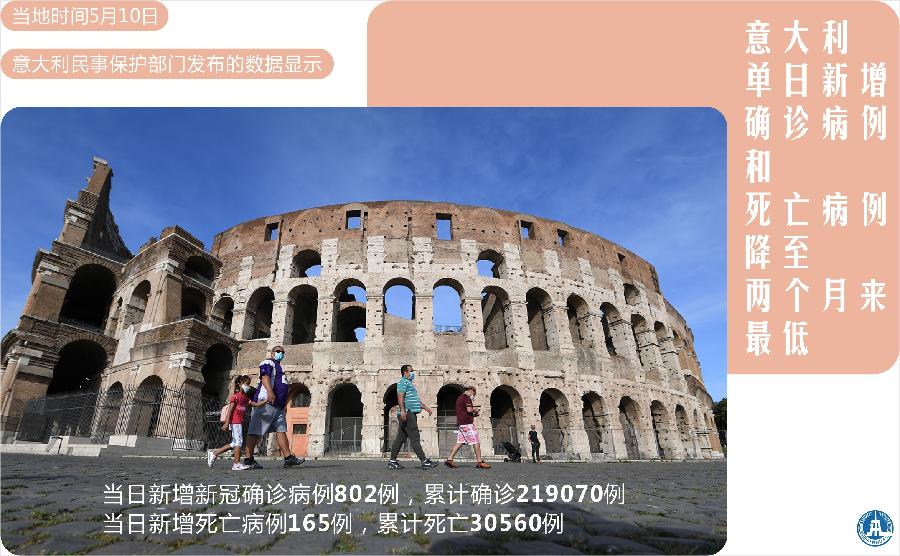 新華社羅馬5月10日電(記者李潔)意大利民事保護(hù)部門10日發(fā)布的數(shù)據(jù)顯示,意大利當(dāng)天新增新冠確診病例802例,累計(jì)確診219070例;新增死亡病例165例,累計(jì)死亡30560例。單日新增確診病例和新增死亡病例均為過去兩個(gè)月來最低水平。