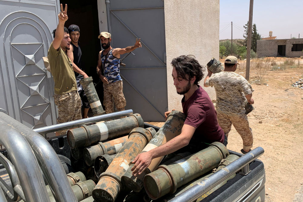 6月5日,利比亞民族團(tuán)結(jié)政府武裝人員在奪回泰爾胡奈市后搬運(yùn)沒收的武器。(新華社/路透)
