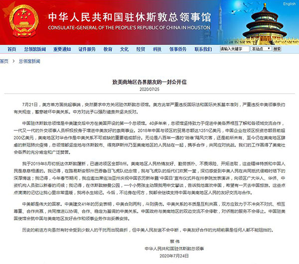 7月21日,美方單方面挑起事端,突然要求中方關(guān)閉駐休斯敦總領(lǐng)館。美方此舉嚴(yán)重違反國際法和國際關(guān)系基本準(zhǔn)則,嚴(yán)重違反中美領(lǐng)事條約有關(guān)規(guī)定,蓄意破壞中美關(guān)系。中方對(duì)此予以強(qiáng)烈譴責(zé)并堅(jiān)決反對(duì)。