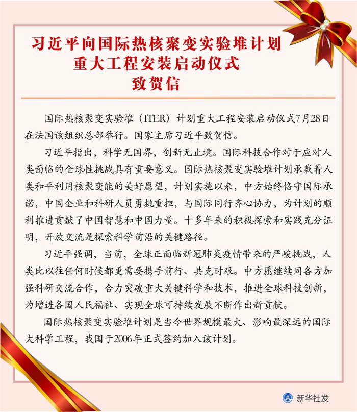 新華社北京7月28日電 國際熱核聚變實驗堆(ITER)計劃重大工程安裝啟動儀式7月28日在法國該組織總部舉行。國家主席習(xí)近平致賀信。